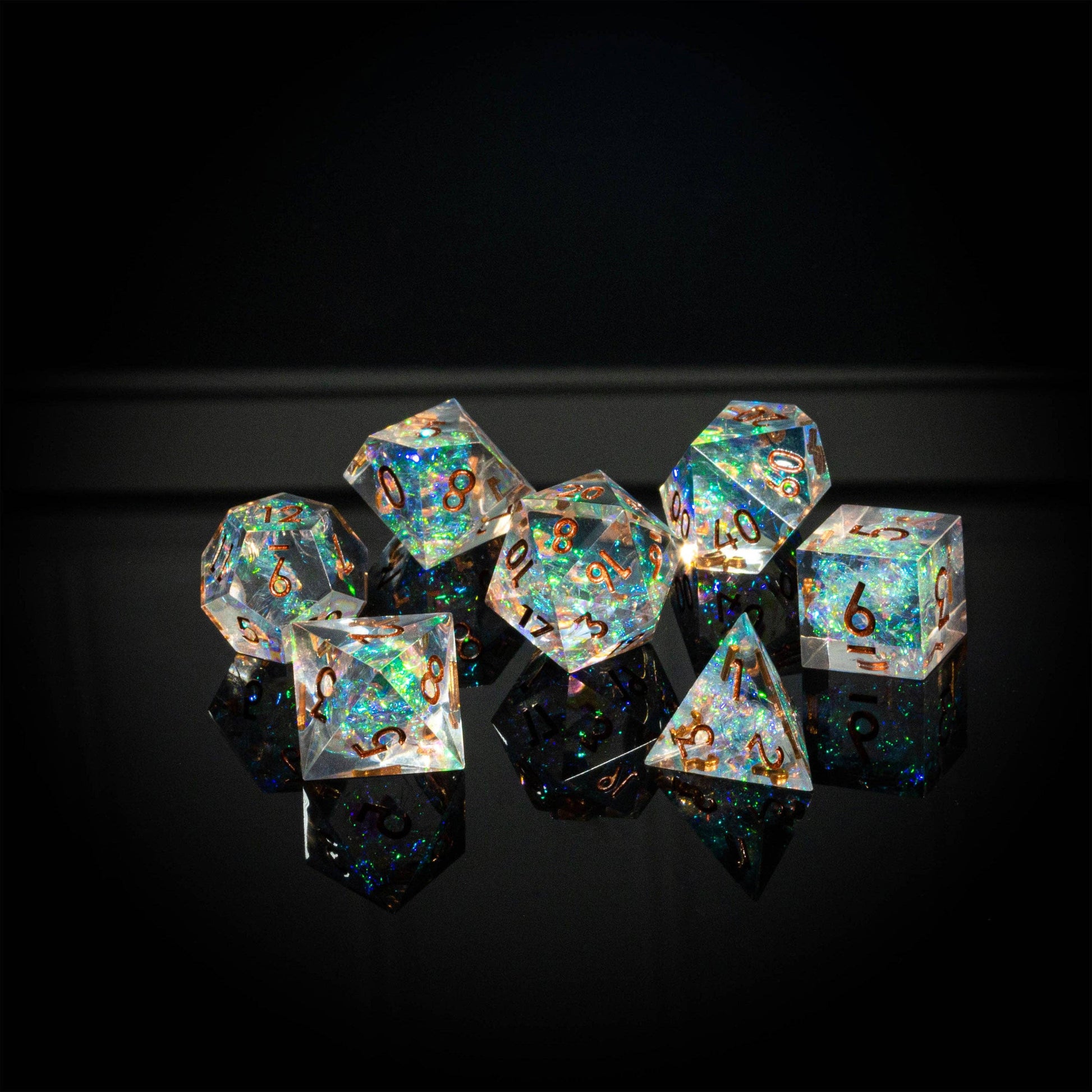 Every single dice set is hand-poured, polished, and painted. No part of this process is automated, so imperfections or differences in color can and will happen. This is due to the nature of how they're crafted and is totally normal. It is impossible to ensure that the dice are identical or look exactly as depicted in our photos. Each set of dice is one of a kind.