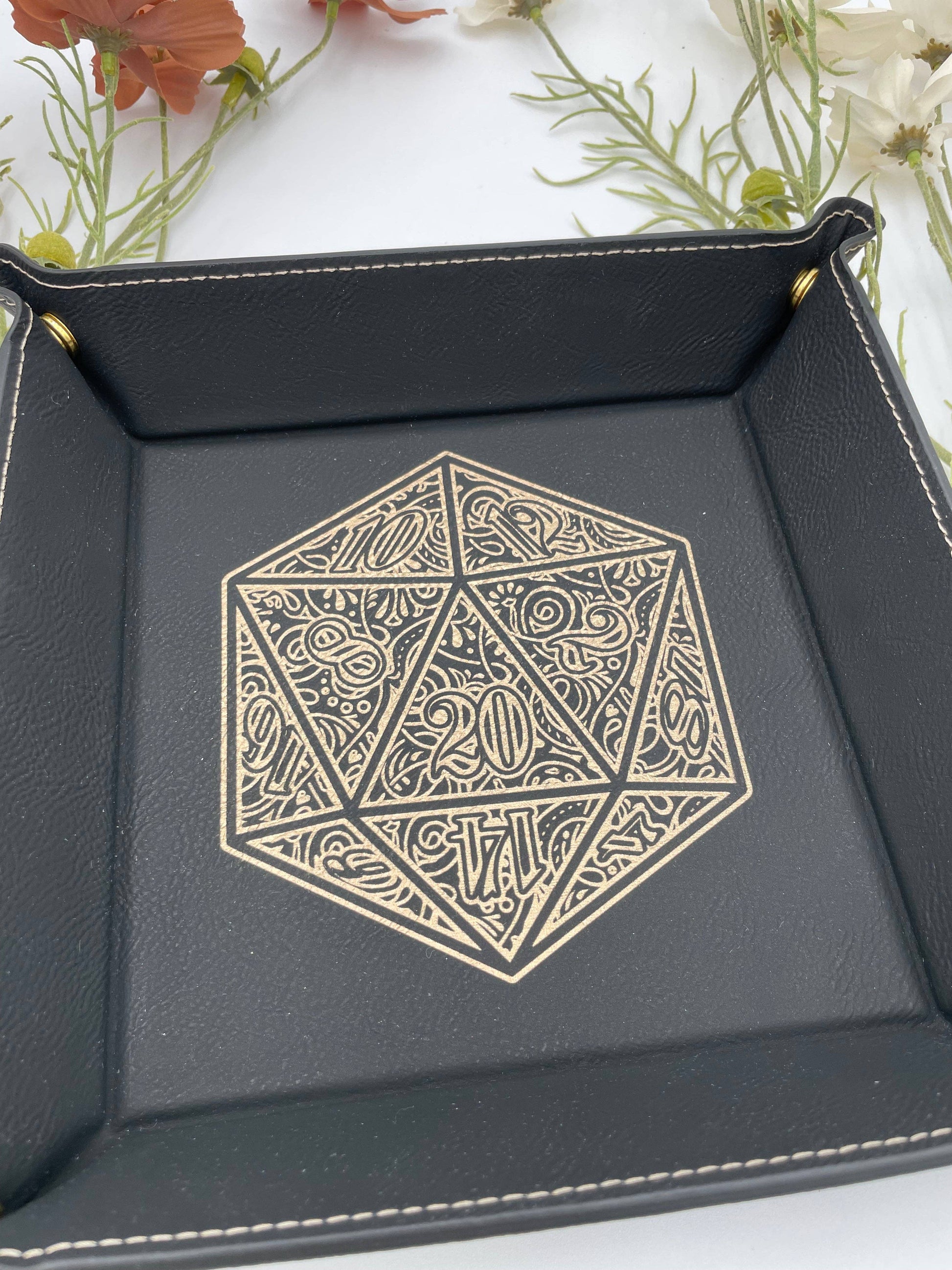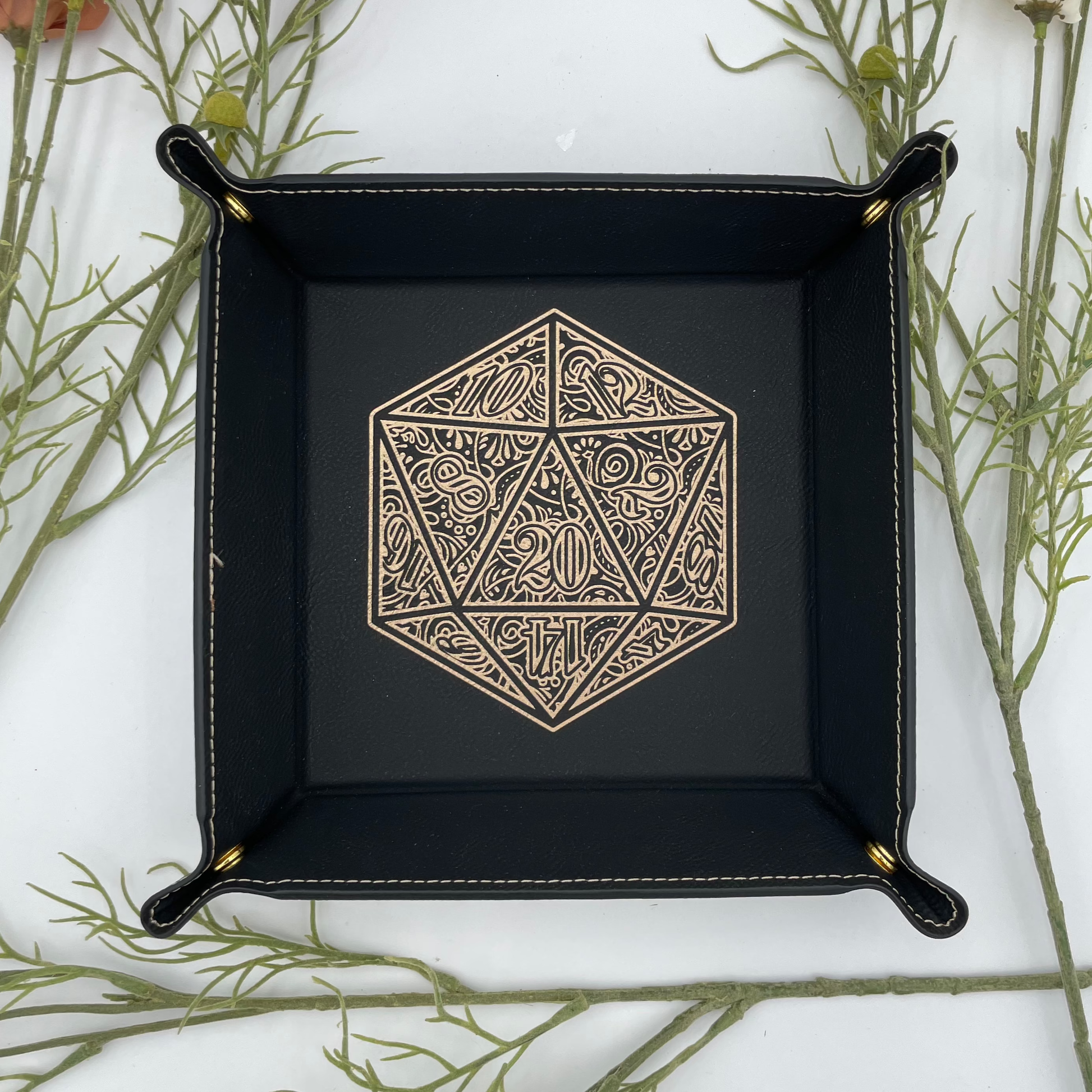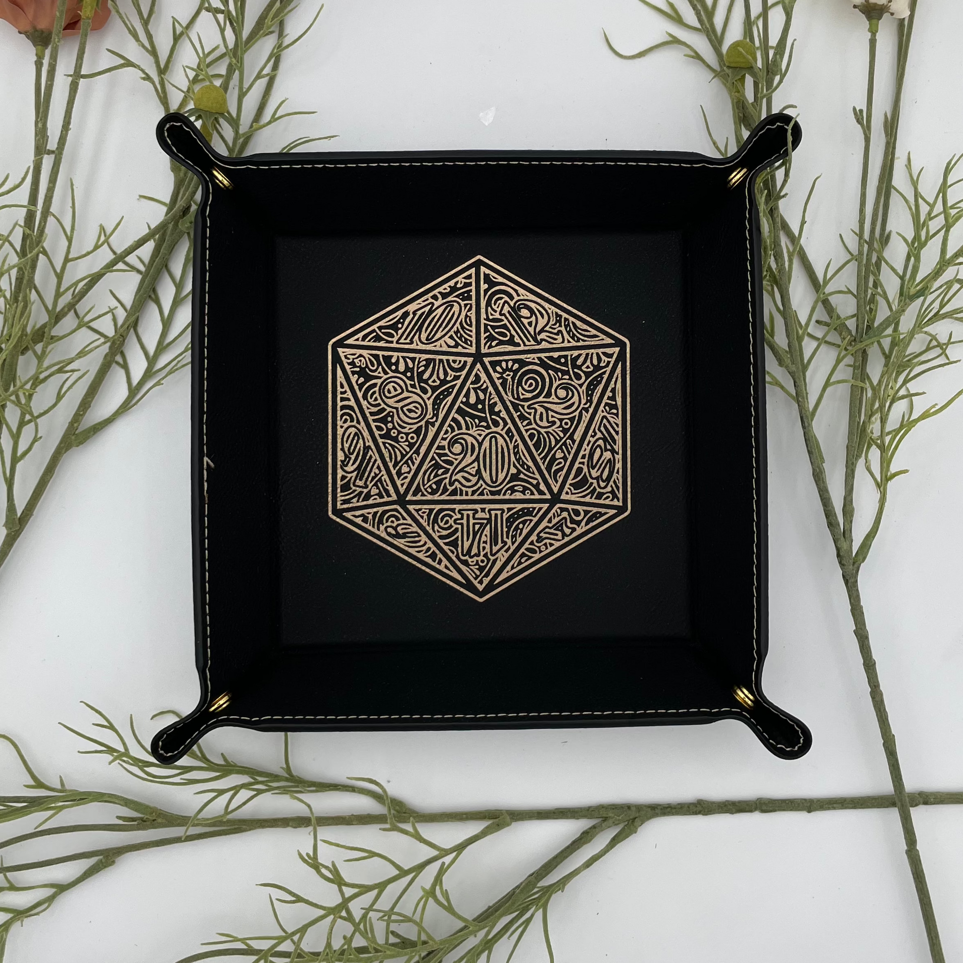 EBONWOOD - Gilded D20 Dice Tray - Vegan Leather DnD Dice Rolling Tray