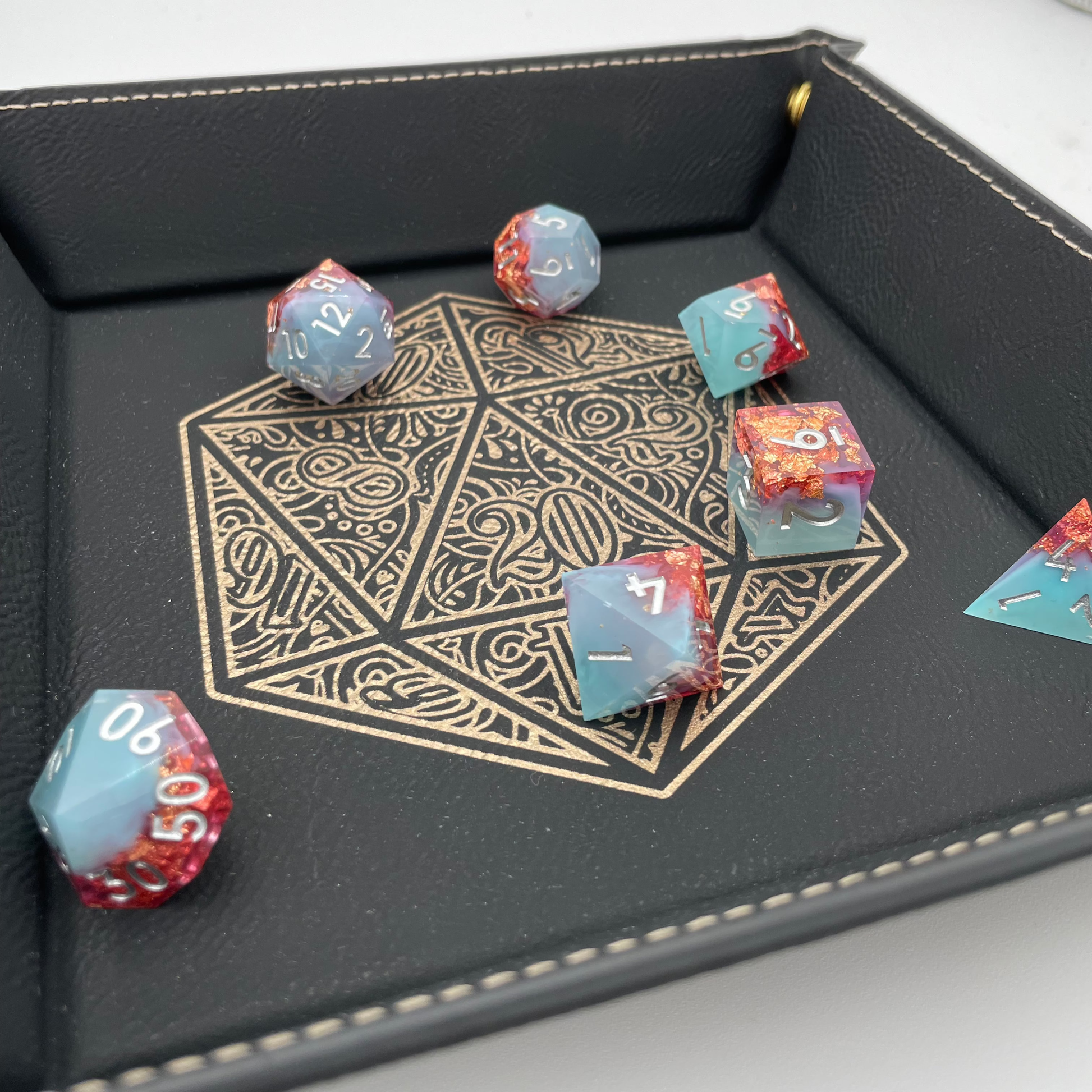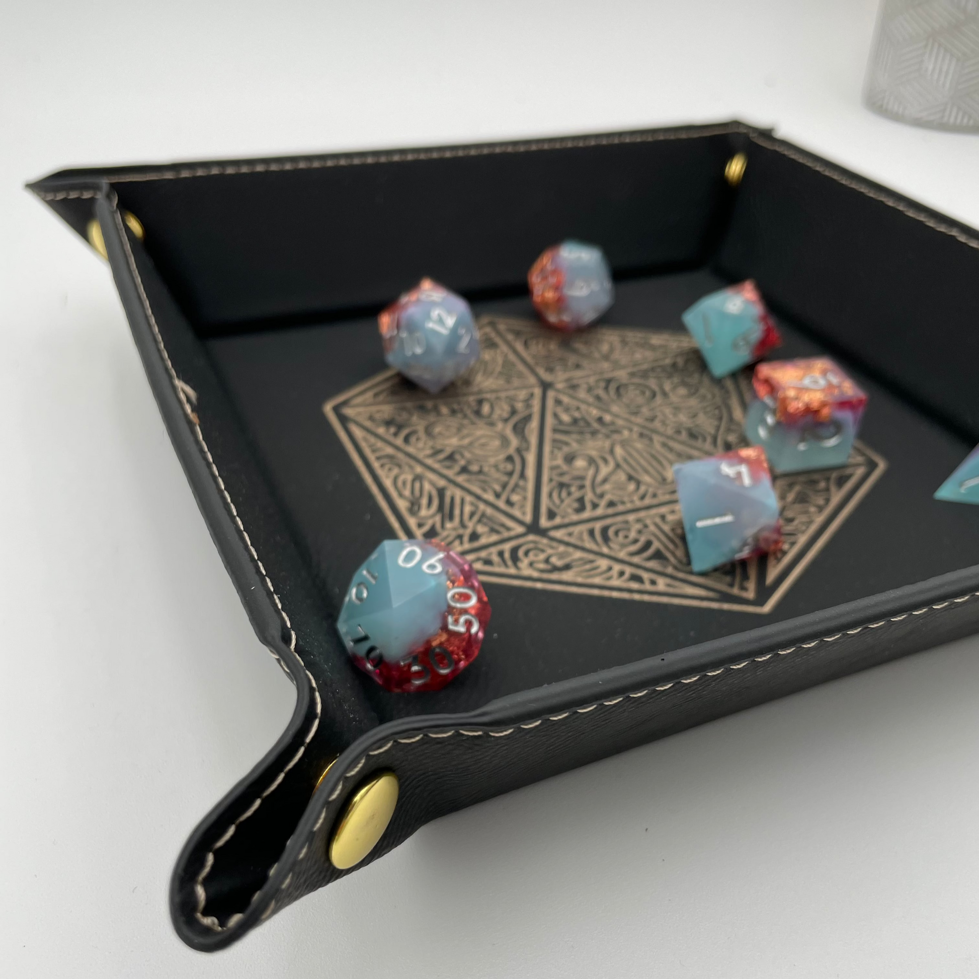 Roll your dice in style and protect them with our Gilded D20 Dice Tray. This regal dice tray is made from black PU vegan leather, features shimmering gold foil artwork engraved through the leather onto a golden layer. The gold snaps keep your rolls secure. Perfect for DnD, Pathfinder, and other TTRPG systems.
