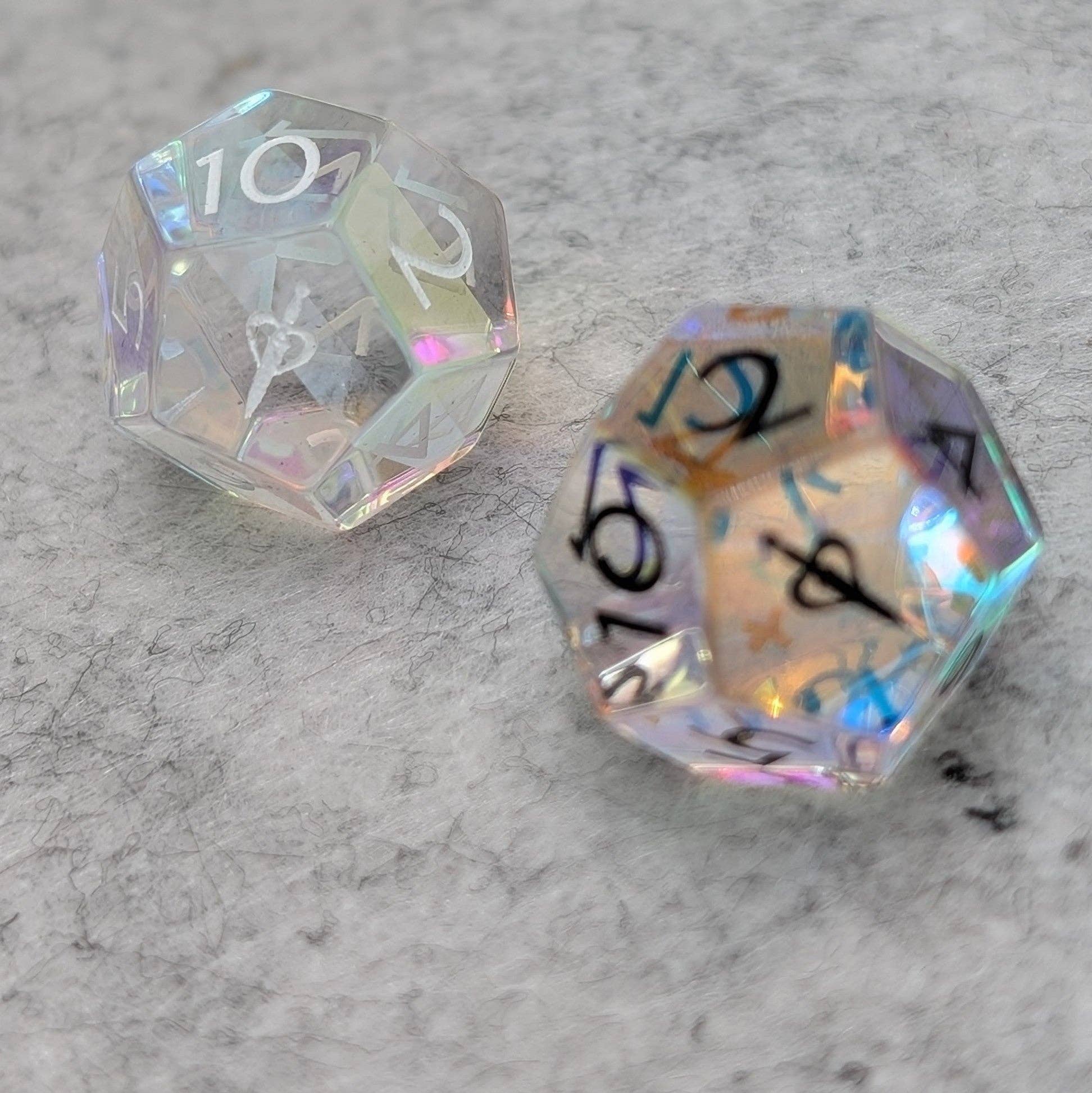 Balance hope and fear with this dazzling pair of Rainbow Glass Duality Dice, crafted for Daggerheart and other narrative tabletop RPGs. Made from vibrant, high-clarity glass, these dice shimmer with prismatic color shifts that catch the light beautifully from every angle.