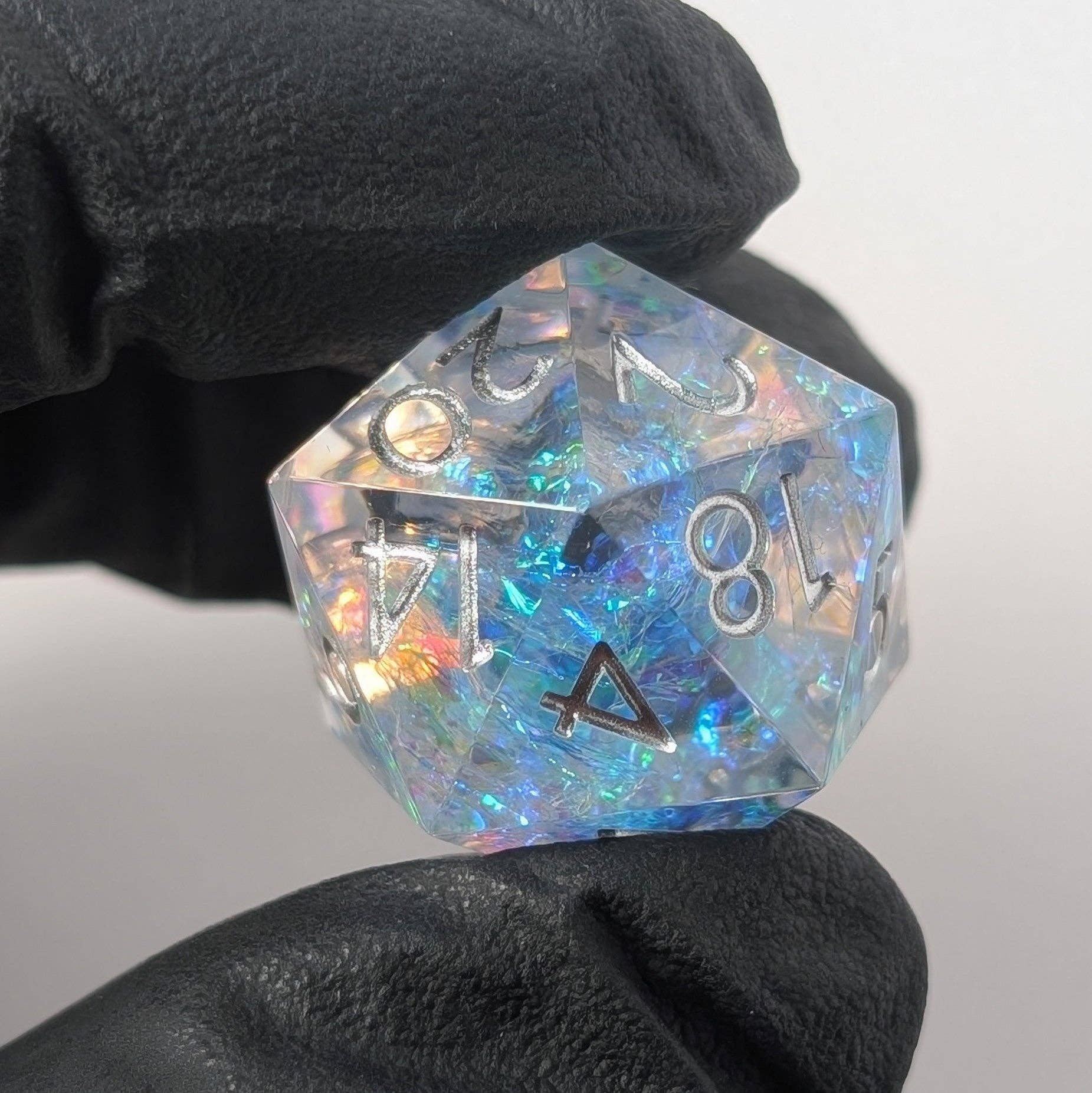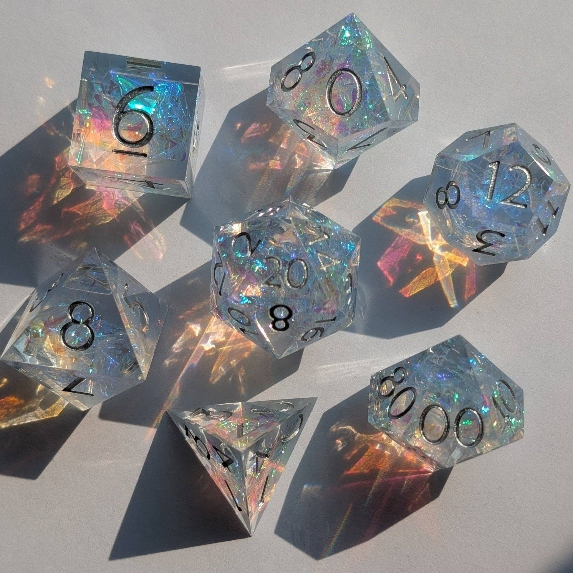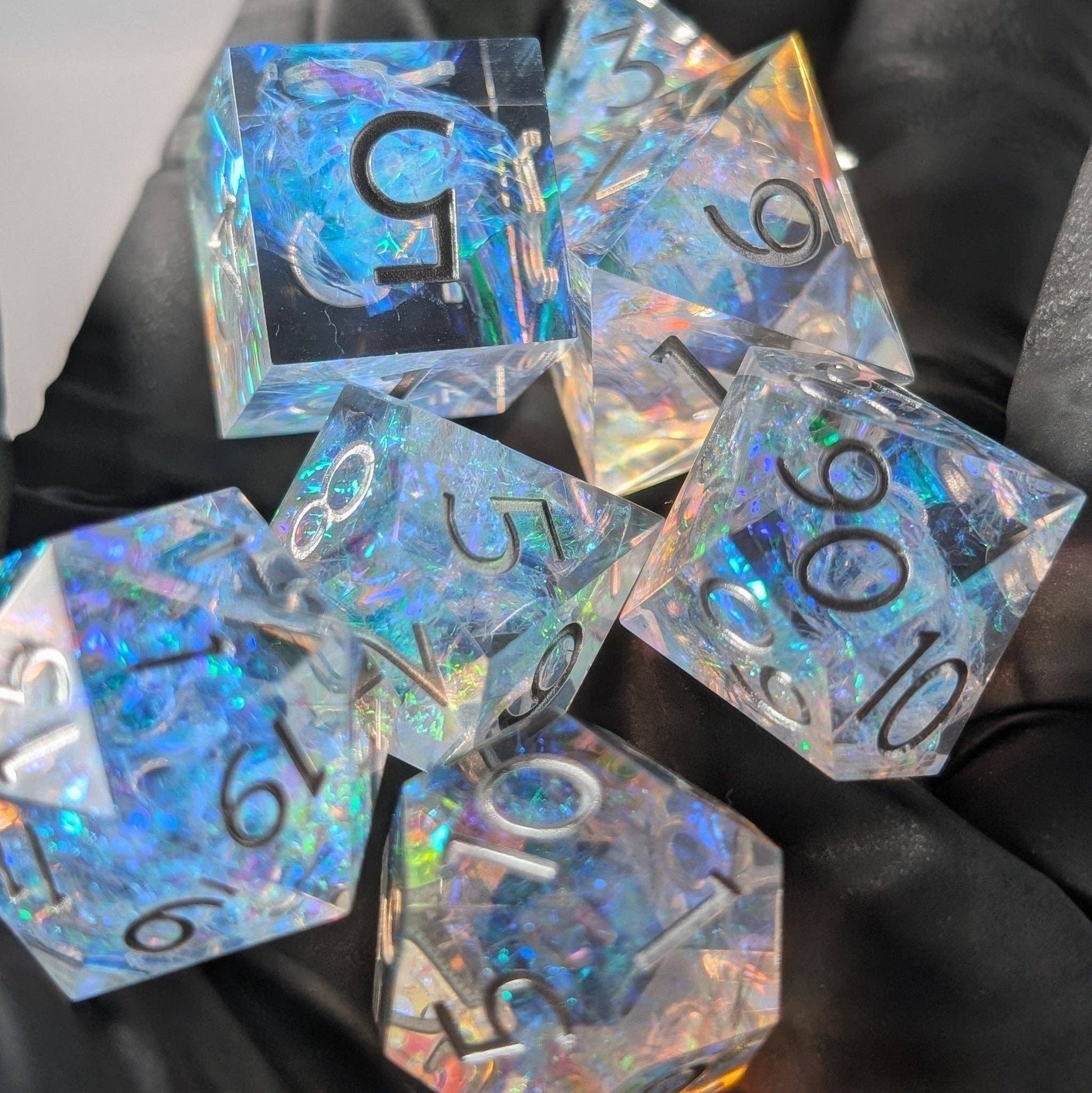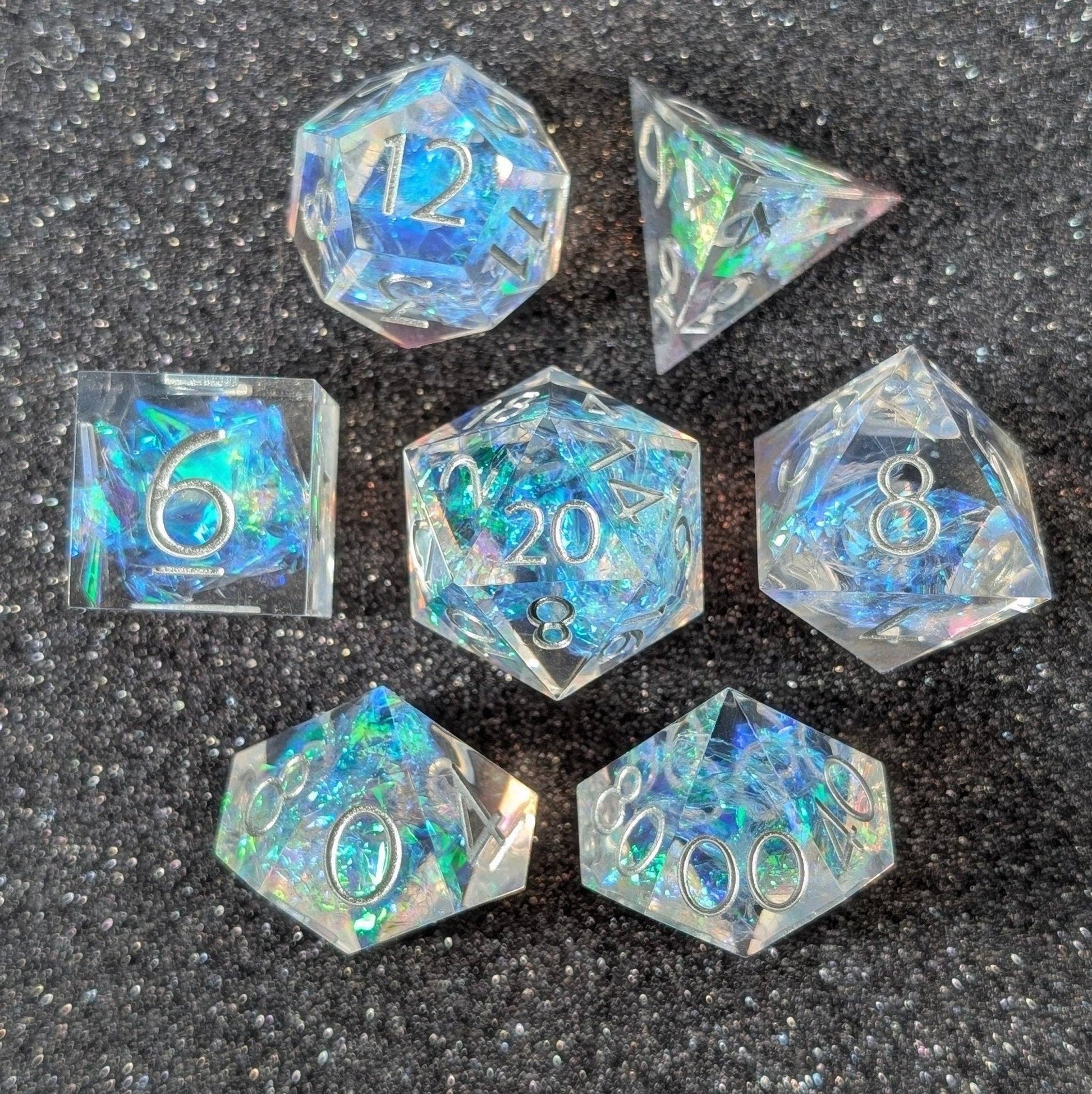 Step into the Feywild with Sylvan Aurora, a sharp-edged polyhedral dice set made for adventurers who crave magic and mischief. These handmade TTRPG dice feature crystal-clear resin with shimmering mylar foil that reflects a stunning spectrum of green and blue — like moonlight dancing through enchanted leaves. Each die is inked in gleaming silver, adding elegance to every roll. Whether you're playing Dungeons & Dragons, Pathfinder, or any tabletop RPG, Sylvan Aurora brings fae glamour to your game.