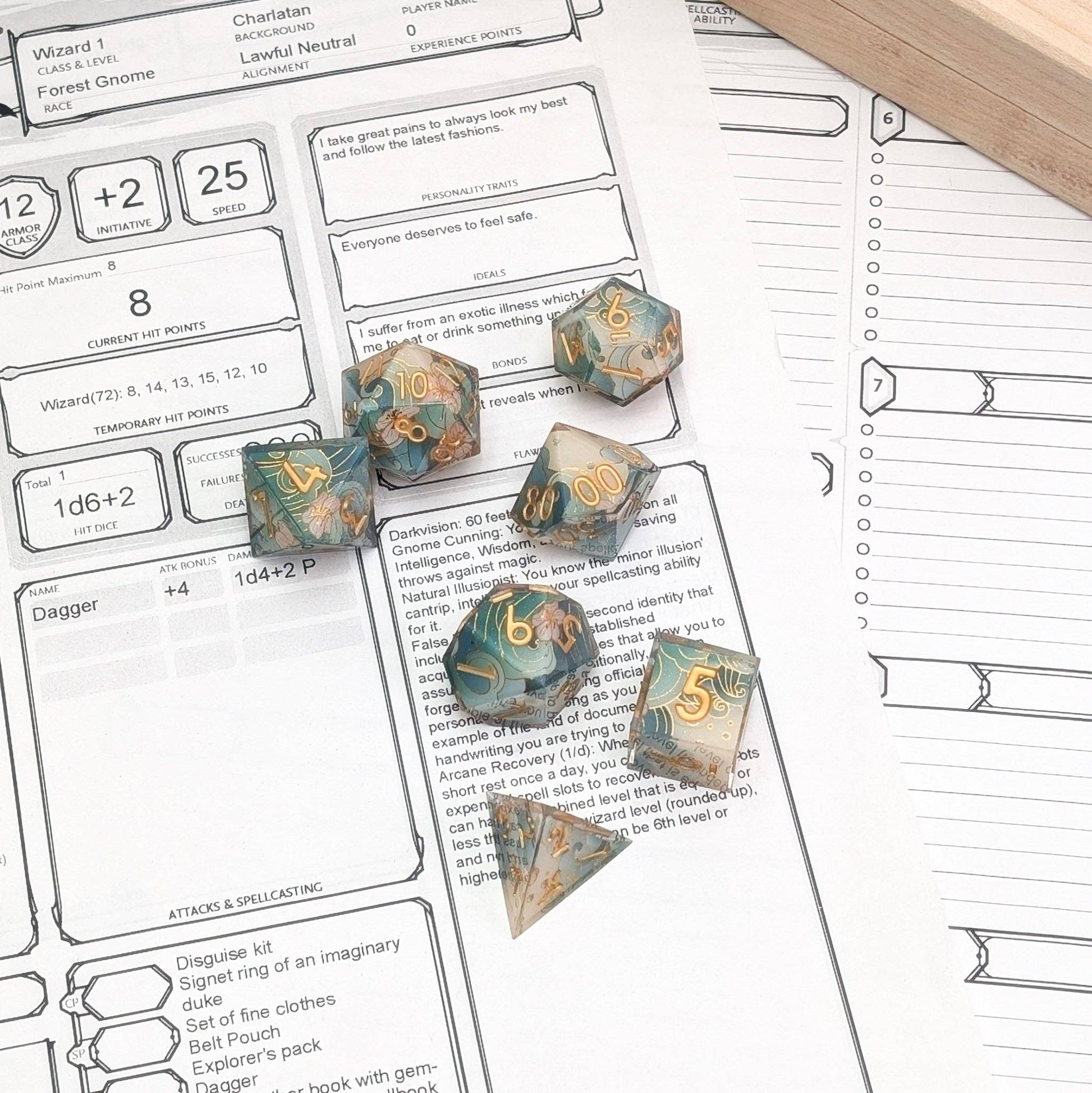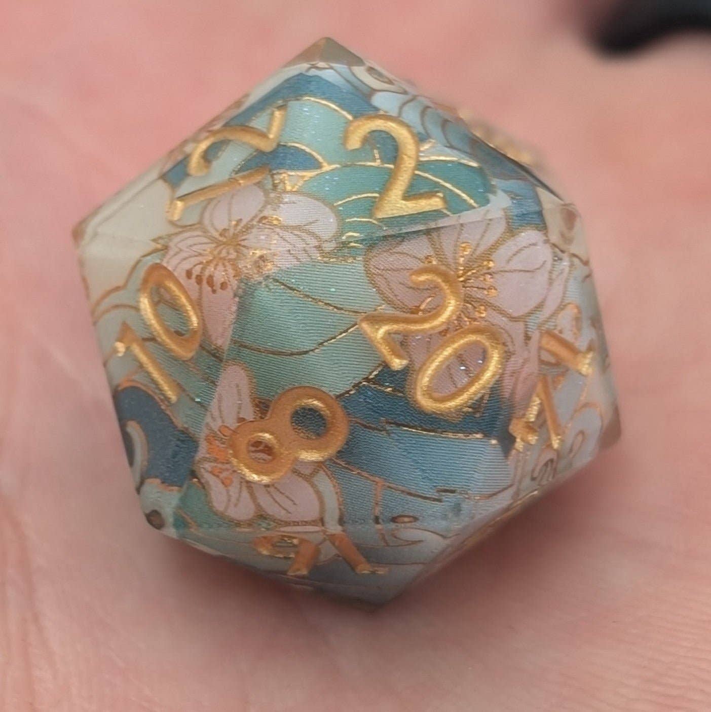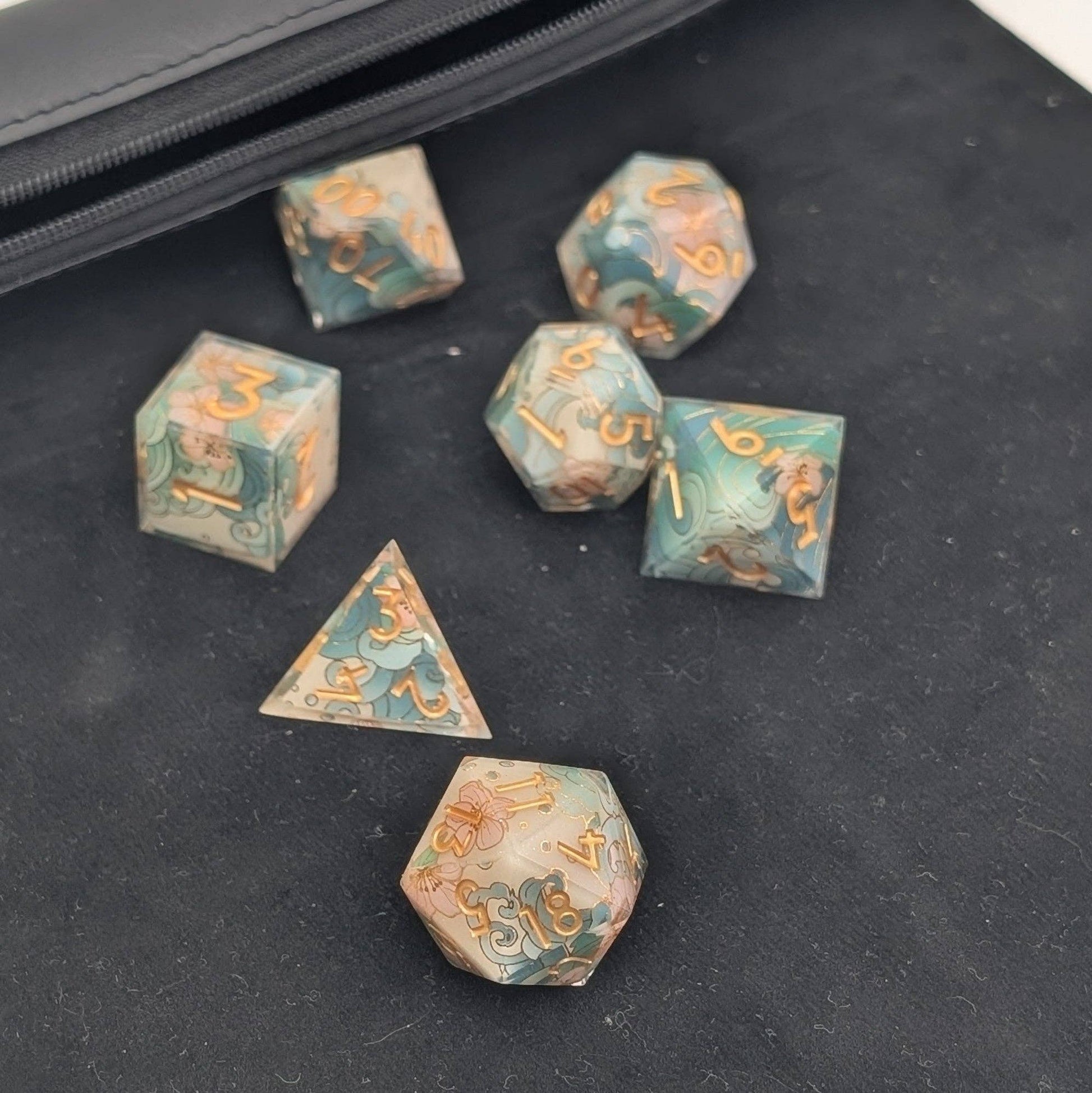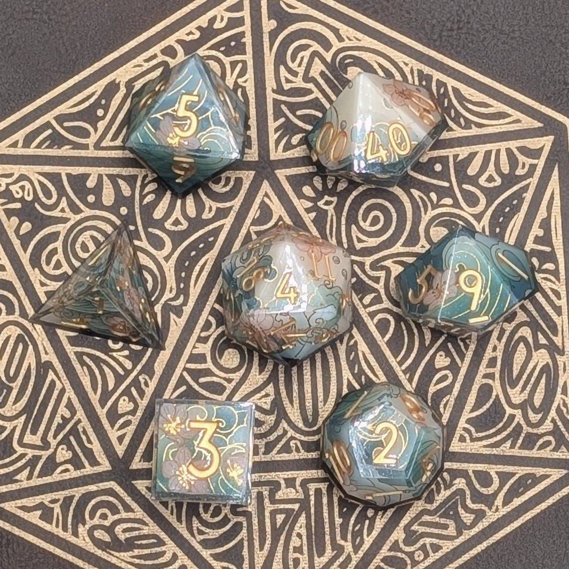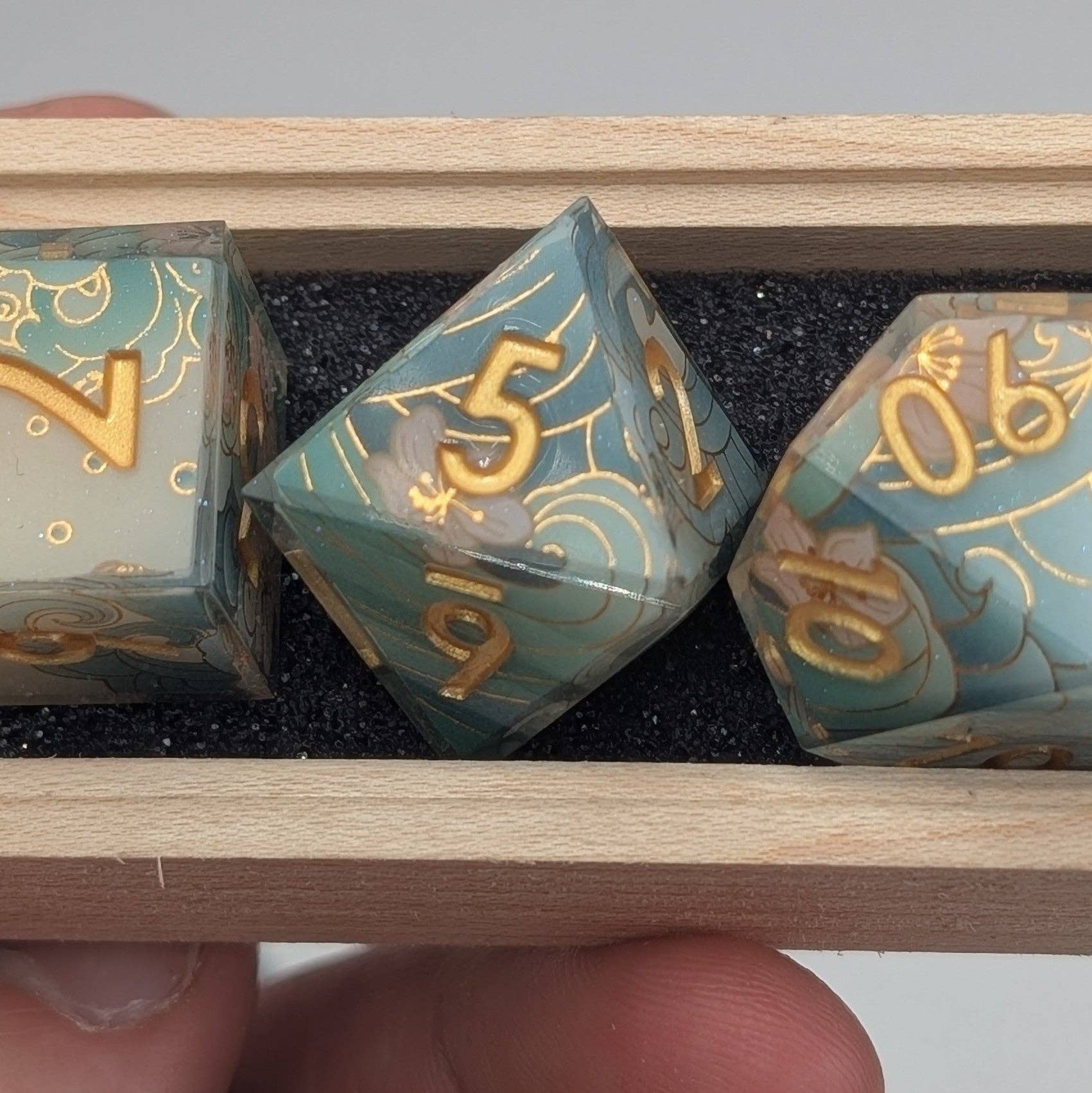Find your calm in the chaos of battle with Tidal Focus, a handcrafted polyhedral dice set designed for Dungeons & Dragons and other tabletop role-playing games. These resin dice swirl with soft ocean blues, delicate florals, and intricate wave patterns—invoking the tranquil strength of the sea. Each die is hand-poured and polished, featuring shimmering gold numbers that shine like sunlight on water.