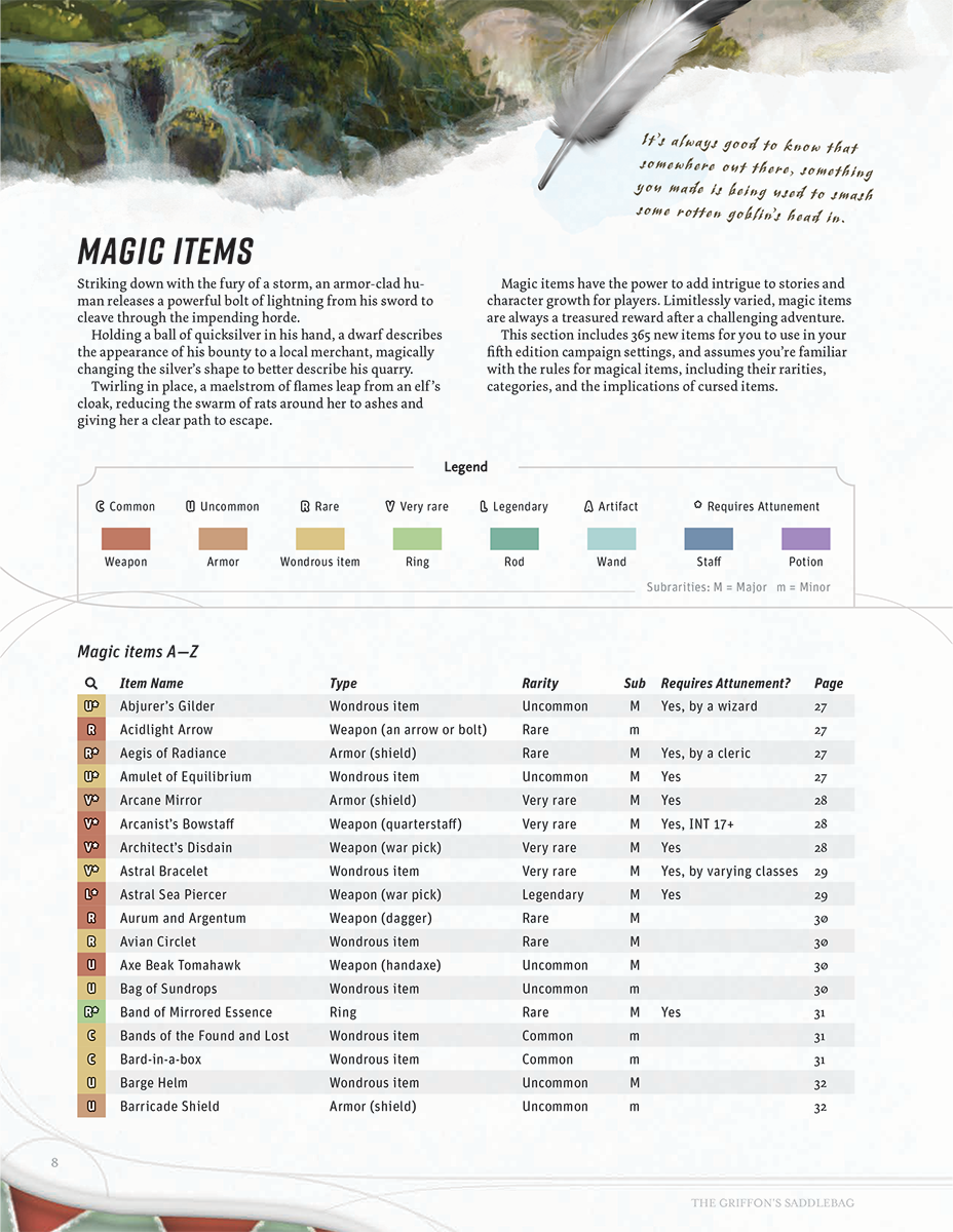 This lushly printed hardcover book is filled with 365 magic items that have been designed, illustrated, and balanced for Fifth Edition by The Griffon's Saddlebag. Fill your campaign with exciting new magical items, such as the dragon tamer's lance or catnip amulet, and reward your players with treasure as unique as their characters. Each item has also been carefully organized into easily searchable charts and random treasure tables. These magical items have been peer-reviewed by thousands of players around the world and strike a charming balance of mechanical intrigue, memorable flavor, and exciting role-playing opportunities. This 208-page book also includes 12 new character subclasses, 3 new settings, a setting-agnostic villain, and a uniquely customizable playable race. If you're tired of using the same old flaming swords or worry about balancing your own magical items, this may be the book you're looking for.