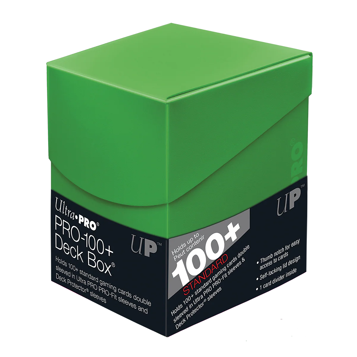 Product Description Ultra PRO's Eclipse PRO 100+ Deck boxes are compact and convenient ways to hold up to 110 standard-sized cards in Deck Protector sleeves. Each durable card storage box is equipped with a self-locking lid design with a built-in thumb notch for easy access to your cards (sleeves, cards not included.) PRO-100+ Deck Box to store and protect your valuable decks. Made with archival-safe, non-PVC rigid polypropylene material. A self-locking lid keeps cards from falling out. Thumb-notch on lid allows easy opening without sacrificing security.