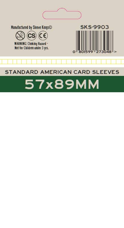Standard American Sleeves (57 X 89mm): $2.50/pack MSRP: Because of the more generous sizing these will fit both cards that are 56 X 87 MM, 57.5 X 88 MM, and 57 X 89 MM. That means these will fit hundreds of games. Games in the 56 X 87 MM size include Fluxx, Bang!, Bohnanza, Ca$h n' Gun$, Dalmuti, Dust, Empire Builder, Fallout, Fireball Island, Flash Point (the Fire Deck), Food Chain Magnate, Ghost Stories, Intrigue, Kill Doctor Lucky, Kingsburg, Munchkin, Mystery of the Abbey, Once Upon a Time, San Juan (2nd Ed), Shadows Over Camelot, The Battle of Five Armies, Ticket to Ride (all but USA mini cards), War of the Ring (1st Edition) and Yu-Gi-Oh CCG.