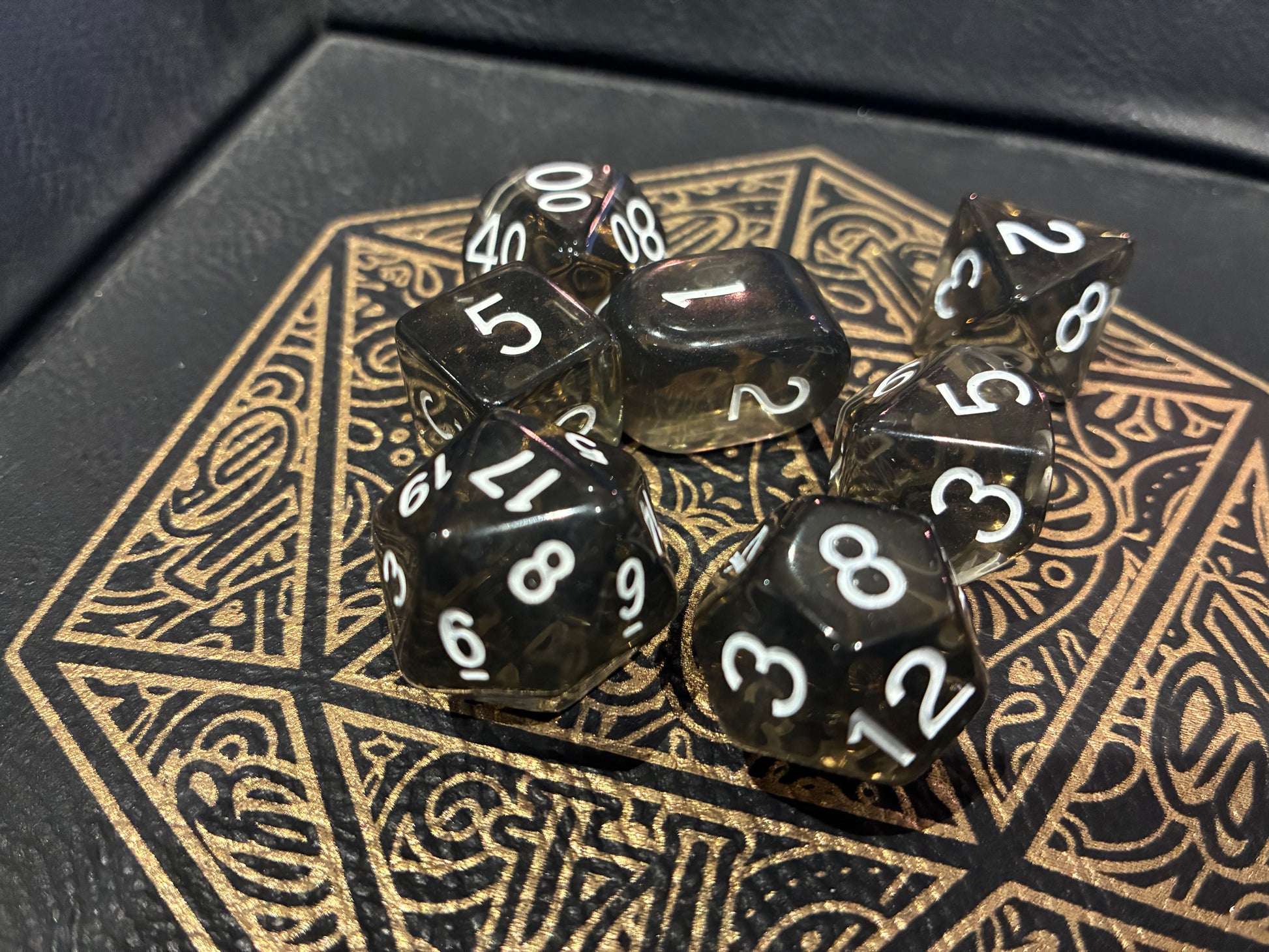 This set of 7 dice contains: Arch'd4, d6, d10, d%, d12, and d20 with yellow or white numbers. This set was made by Role 4 Initiative.