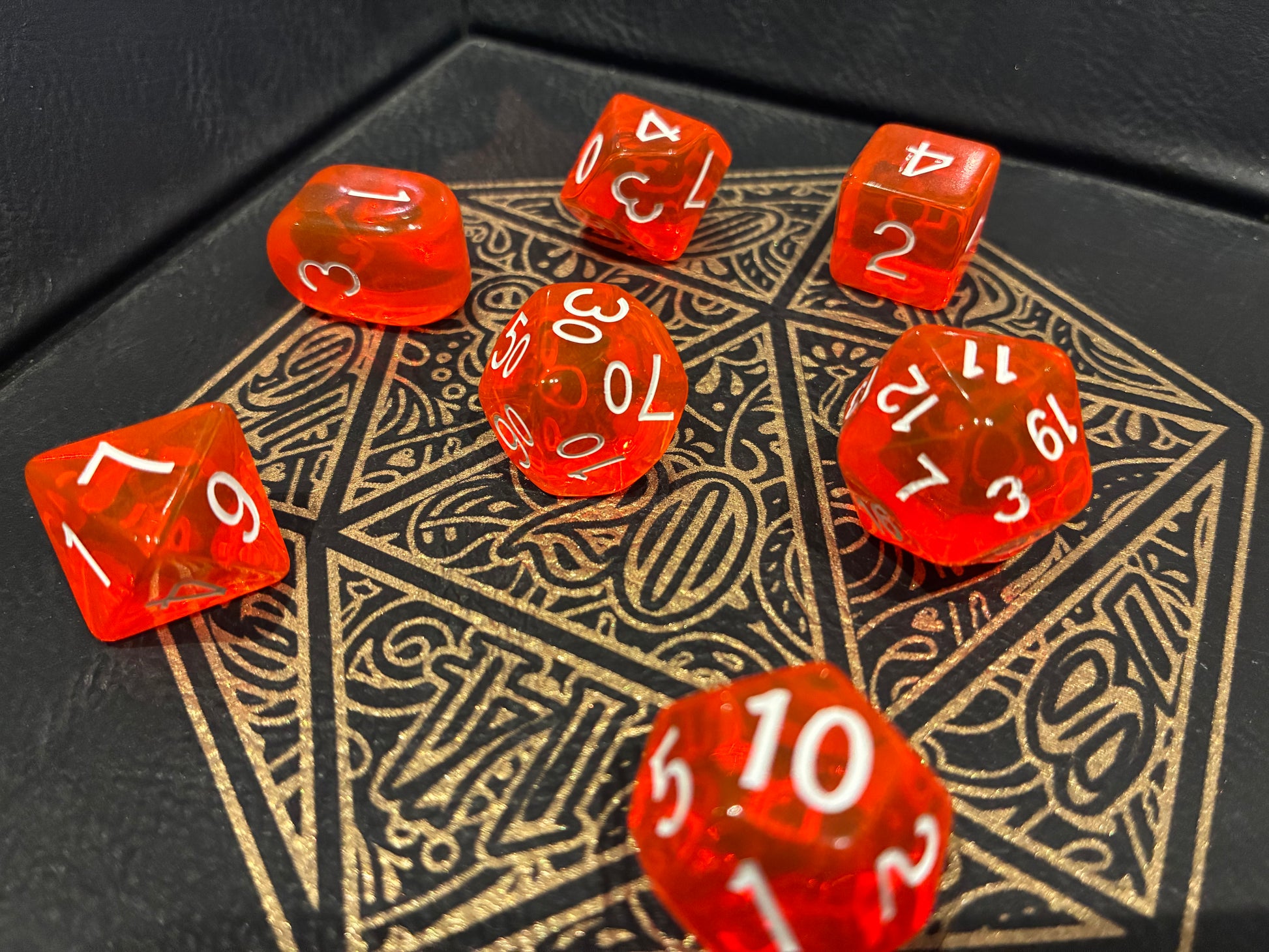 This set of 7 dice contains: Arch'd4, d6, d10, d%, d12, and d20 with yellow or white numbers. This set was made by Role 4 Initiative.