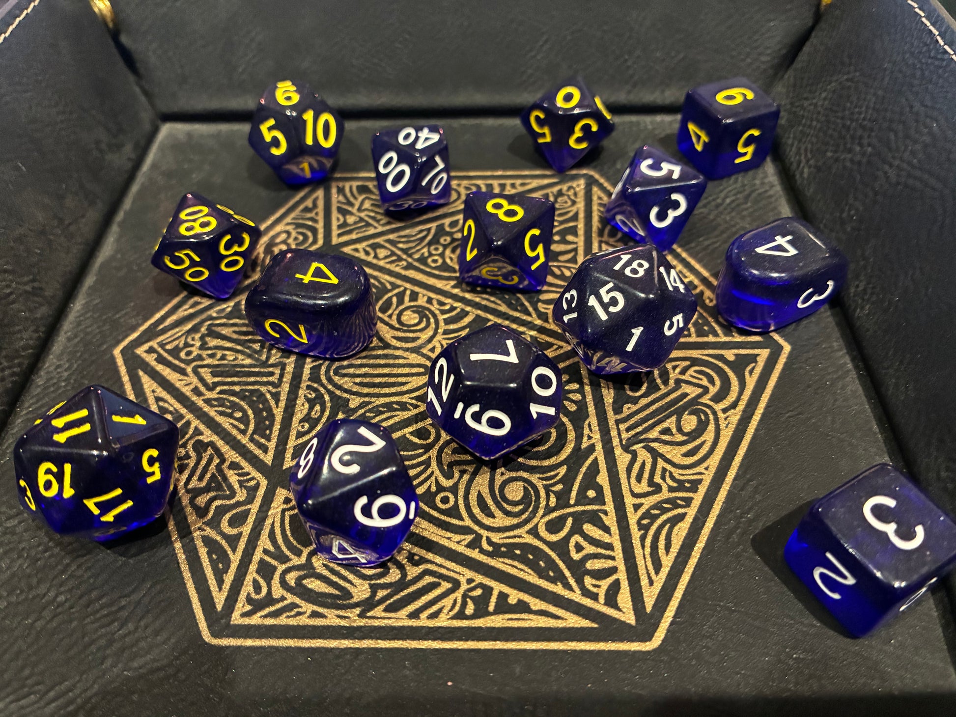 The set of 7 dice contains: Arch'd4, d6, d8, d10, d%, d12, and d20 with either white, blue, or yellow number. Made by Role 4 Initiative.
