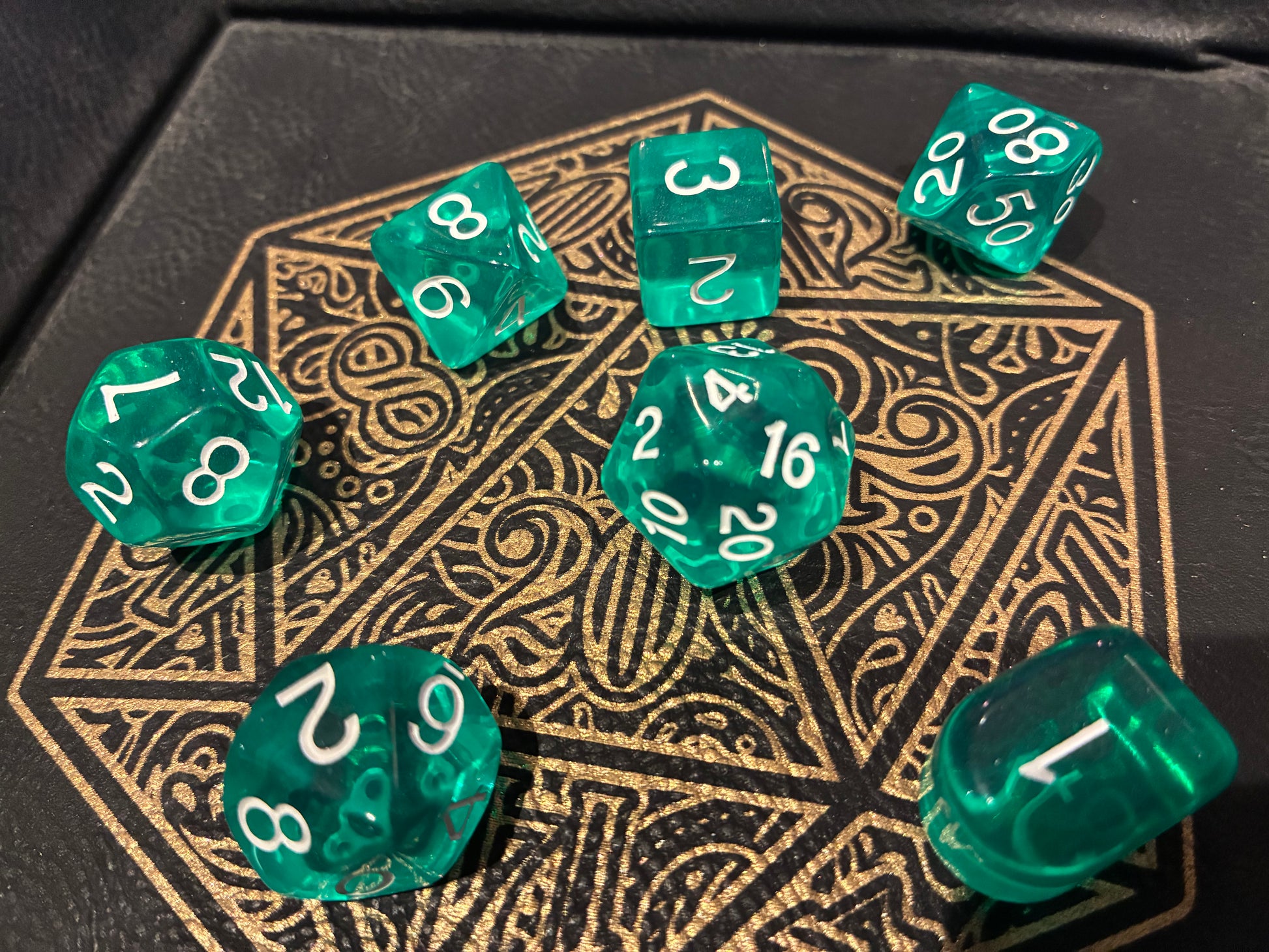 This set of 7 dice contains: Arch'd4, d6, d10, d%, d12, and d20 with white numbers. This set was made by Role 4 Initiative.
