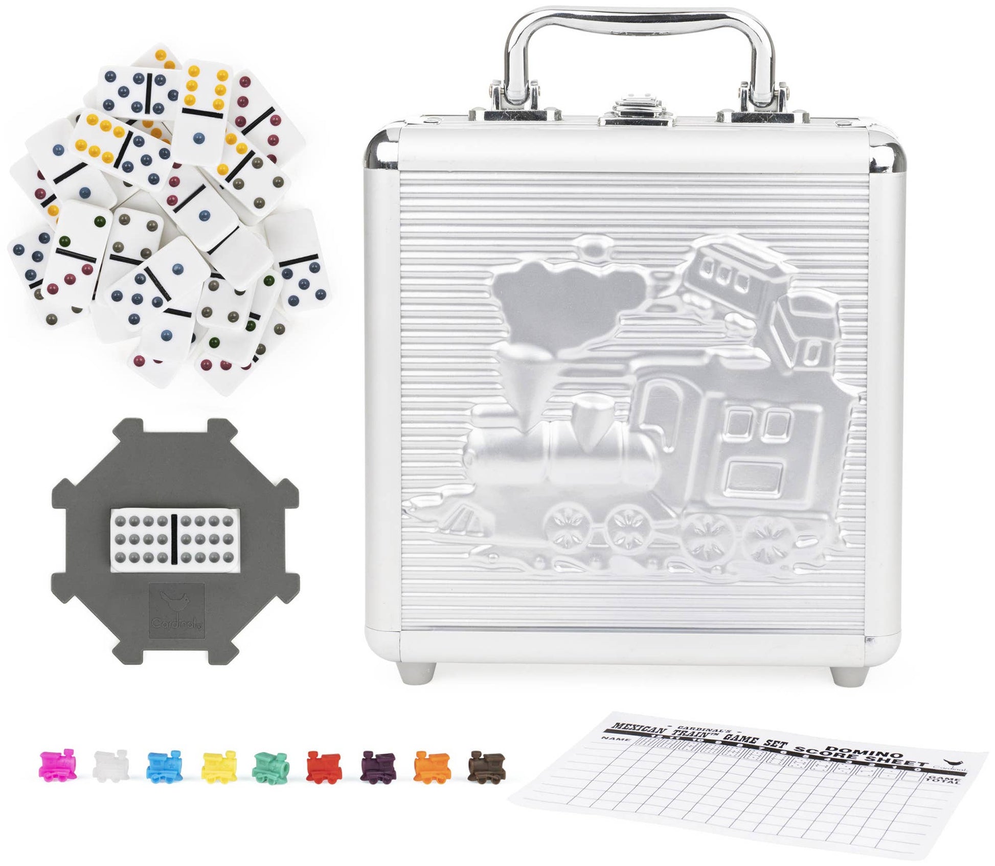 Enhance kids' simple math skills with a fun-filled round of Dominoes. Set includes 91 color dot, ivory-colored dominoes, starter pieces, 9 plastic trains and sleek aluminum case. 2-8 players. Ages 8Y+.